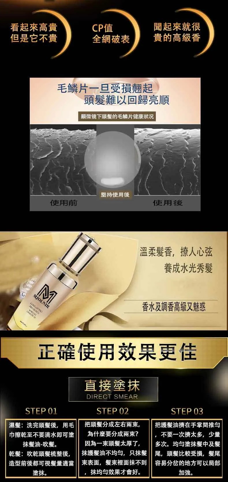 1.這是一款CP直非常高的髮油,使用後秀髮絲柔滑順,在洗完頭後使用可以在你吹頭髮時更加金亮不毛躁。